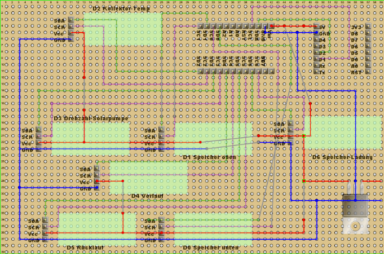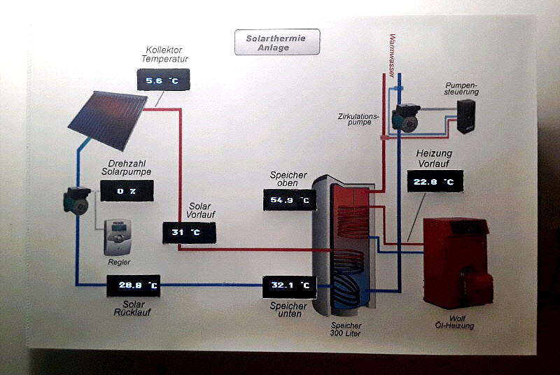 Lochraster-Platine und mechanischer Aufbau: Die Anzeigetafel, auf der die Temperaturen unserer Solarthermie-Anlage dargestellt werden, sollte in einen vorhandenen IKEA-Bilderrahmen eingebaut werden. Dazu habe ich die Komponeten auf eine Lochraster-Platine gelötet und mit dem 3D-Drucker ein enspr. Gehäuse ausgedruckt.