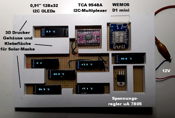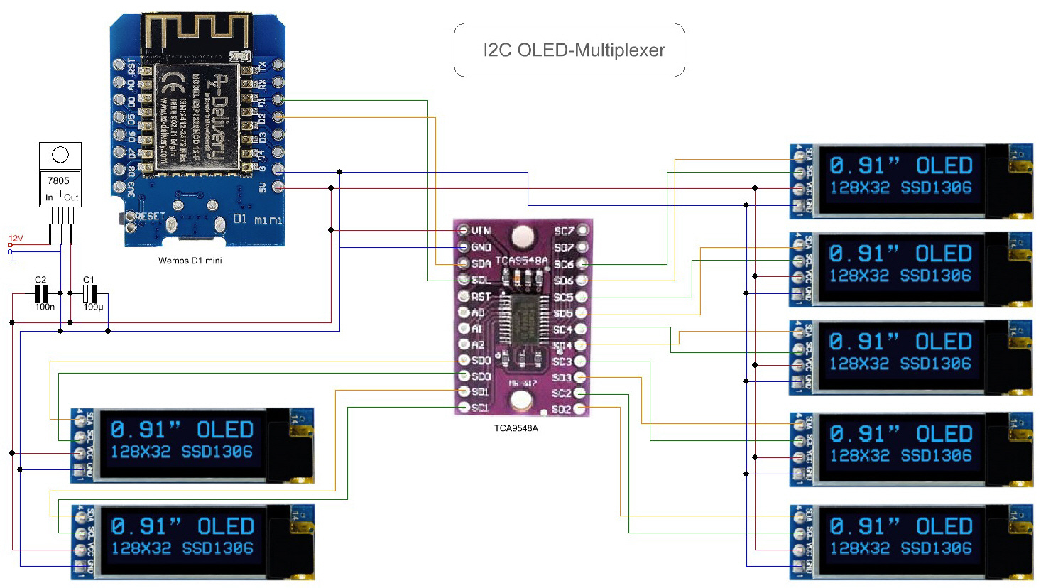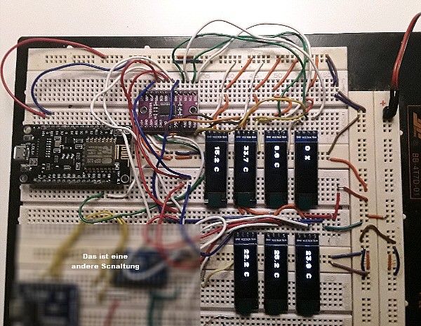Beispiel: Anzeige-Tafel für Solarthermie-Anlage mit mehreren 0.91" OLEDs: ( autark zur bereits vorhandenen ioBroker VIS-Anzeige ) ![]() Einleitung: Hier möchte ich zeigen, wie man an einen WEMOS D1 mini (oder NodeMCU) mehrere I²C-Komponenten anschließen kann . Ich habe dazu mehrere OLEDs ( 0.91", 128x32, SSD1306 )verwendet. An sich ist der Anschluß mehrerer I²C-Komponenten ( z.B. OLEDS, Temp-Sensoren, etc. ) an den I²C--Bus unproblematisch, allerdings gibt es Probleme, wenn diese Komponenten die gleiche I²C-Adresse verwenden. Bei den meisten OLEDs kann man zwischen 2 Adressen ( i.d.R. 0x3C, 0x3D ) wählen, die per Jumper, oder Lötbrücke einstellbar sind. Meine 0.91"-OLEDs verwenden jedoch alle die gleiche I²C-Adresse ( 0x3C) und diese ist auch nicht änderbar. Abhilfe schafft hier ein sog. I²C-Multiplexer, der nacheinander die OLEDs ansteuert. Mit anderen Worten: Die OLEDs haben zwar alle die gleiche Adresse, da diese aber nacheinander angesteuert werden, ist immer nur jeweils 1 OLED aktiv. Bei dem Multiplexer handelt es sich um den TCA 9548A, der seinerseits die Adresse 0x70 am I²C-Bus besitzt. An den Ausgängen dieses Multiplexers kann man insgesamt 8 I²C-Komponeten anschließen. An die Ausgänge könnte man auch wiederum weitere Multiplexer anschließen, d.h. die Multiplexer kaskadieren. Das habe ich aber nicht getestet. Schaltplan und Testaufbau: Hier also mein Schaltplan und ein erster Testaufbau: