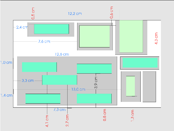 Die Positionen der einzelnen OLEDs habe ich ausgemessen und anschl. mit CorelDraw ein maßstabsgerechtes Anlagen-Schema gezeichnet und dieses in der entspr. Größe (ca. 13x18 cm ) auf Fotopapier ausgedruckt. Die hellgrünen Flächen in der Papier-Schablone wurden mit einem Skalpell ausgeschnitten, damit die Werte der darunter liegenden OLEDs sichtbar werden: