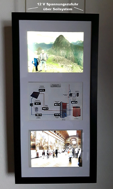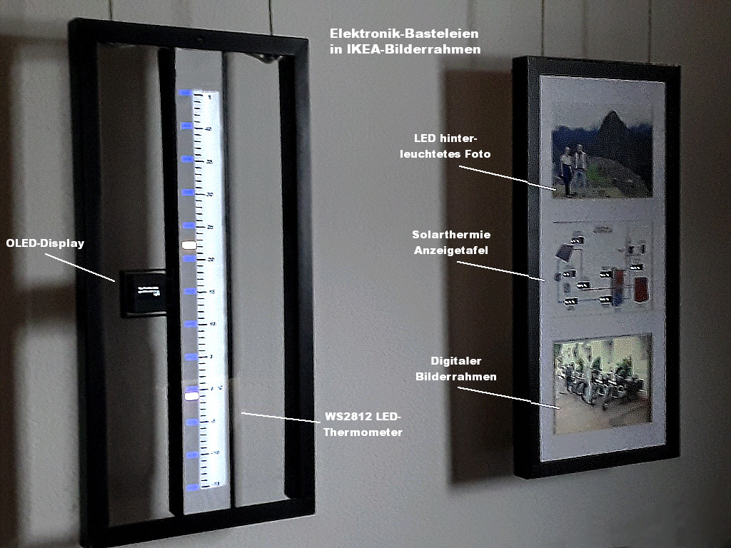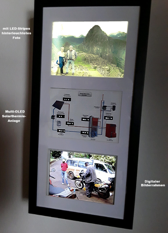 Dies ist nur ein grober Überblick, was im Sketch passiert, schaut es euch im ################################################################ Arduino-Sketch multi-oled.ino ################################################################ am besten selbst an. Abschließend noch ein paar Fotos, wie die Anzeige-Tafel in den anfangs erwähnten IKEA-Bilderrahmen eingebaut wurde: (Anklicken zum Vergrößern)