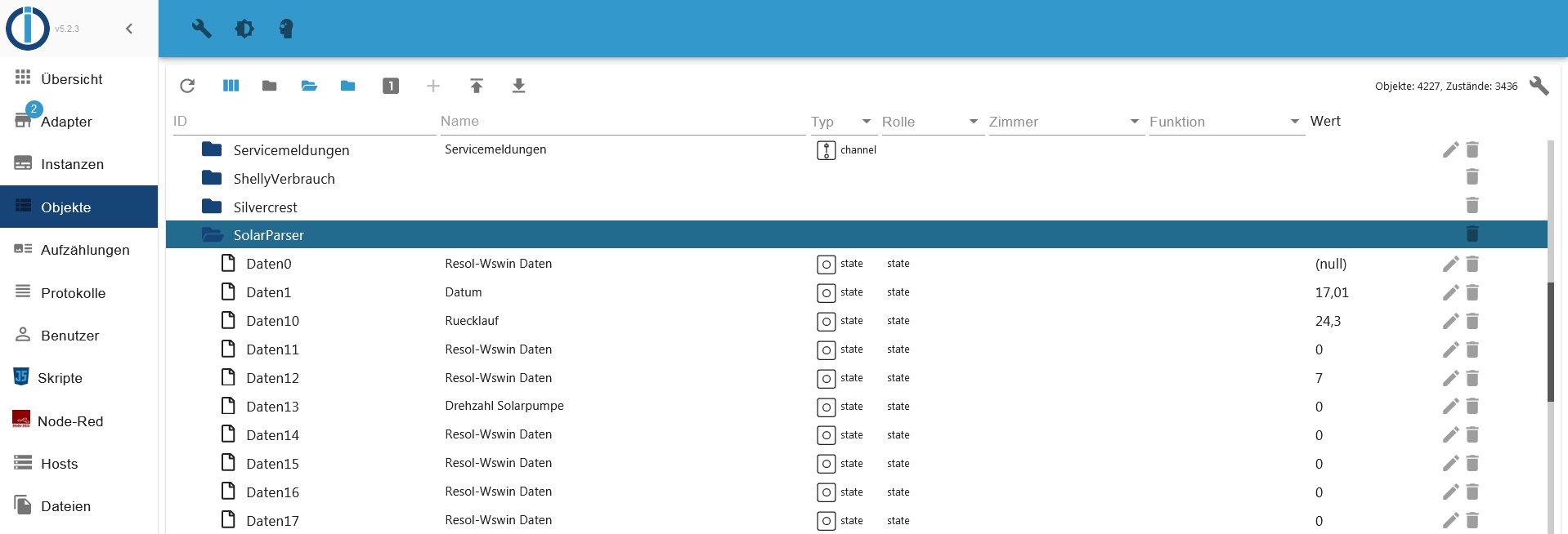 Software: Man sollte sich in der Programmierung von Micro-Controllern via Arduino-IDE etwas auskennen, sodaß ich auf "Standard-Sachen", wie z.B. das Einbinden von libraries (Bibliotheken) hier nicht weiter eingehen möchte. Der Vollständigkeit halber, in diesen Sketch werden folgende libraries eingebunden: #include <Arduino.h> #include <U8g2lib.h> #include <Wire.h> #include <ESP8266WiFi.h> #include <PubSubClient.h>> #include <ArduinoOTA.h> Die ioBroker-Objekte (neben weiteren hier nicht benötigten) unserer Solarthermie-Anlage liegen im Zweig "javascript.0.Solarparser":